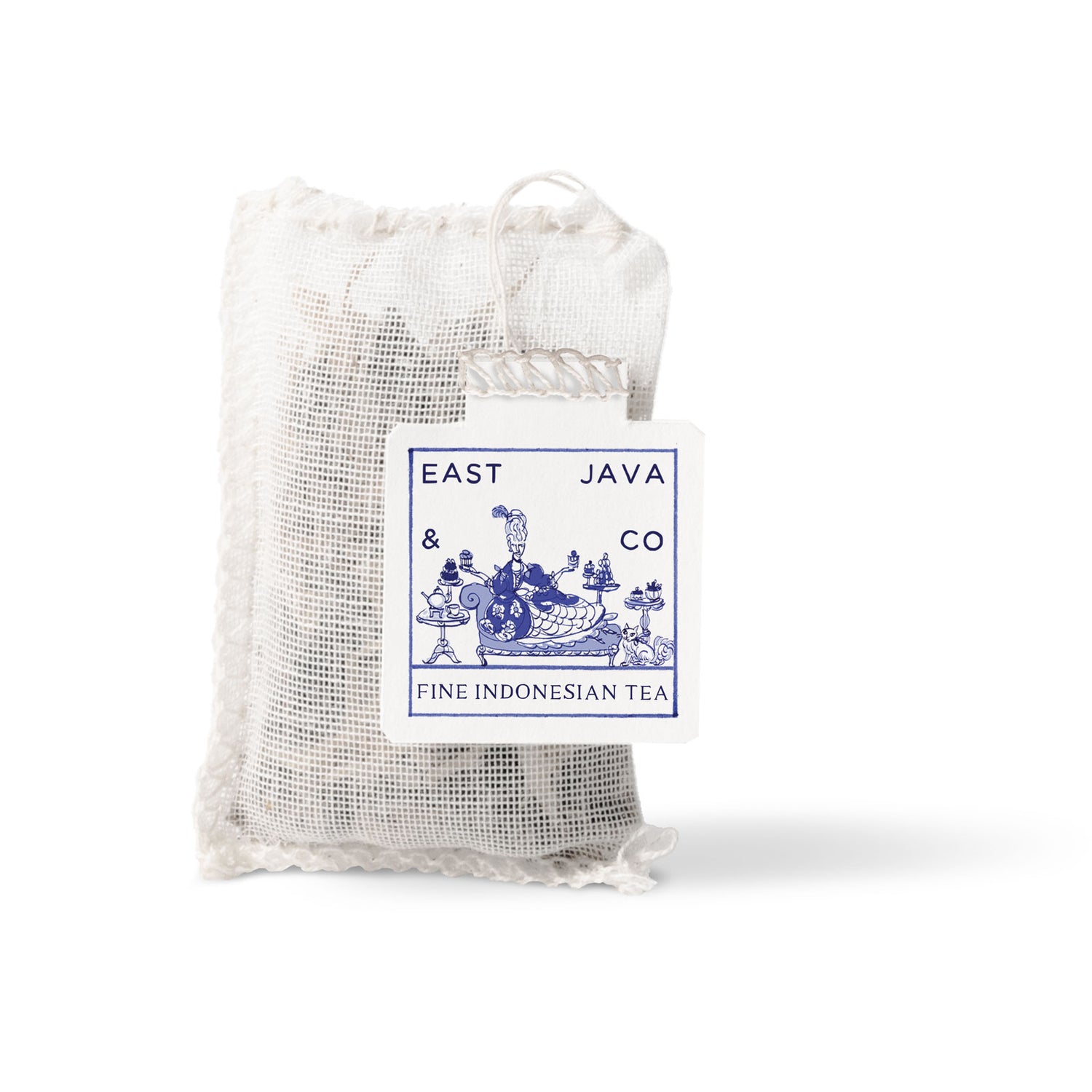 Our blue & white cube box, filled with 15x premium natural cotton tea bags.