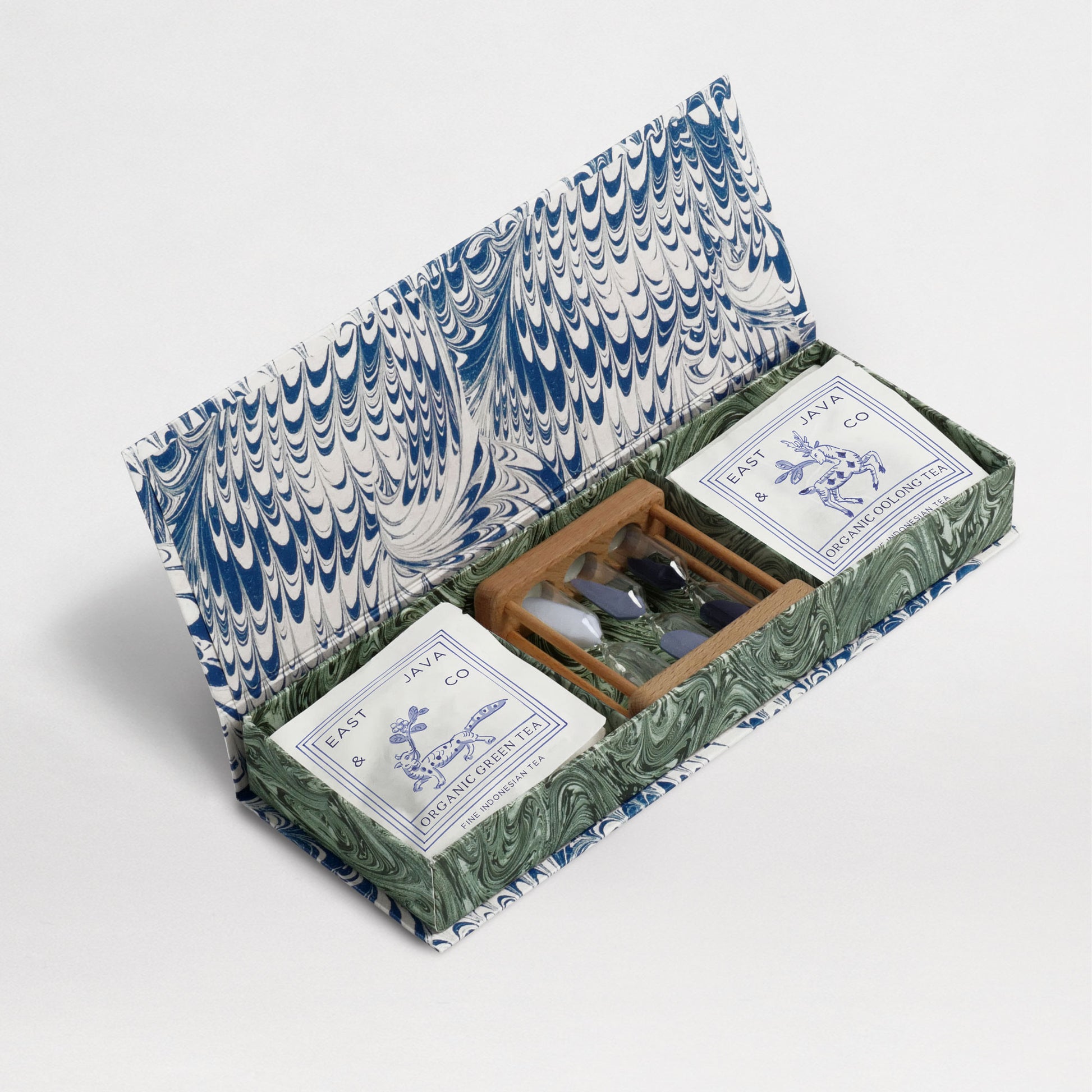 Two organic single estate teas from the highlands of Java — green and oolong — paired with a wooden hourglass timer, presented in our handcrafted marbled gift chest.